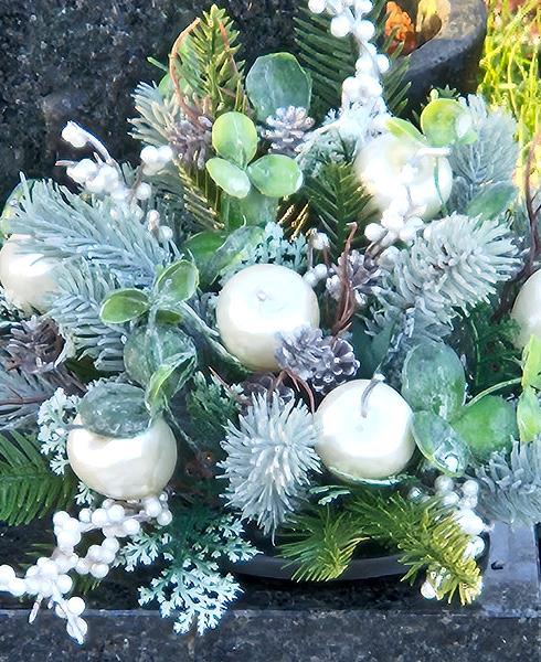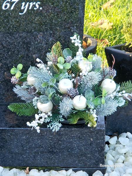 Illuminate your loved one's resting place during winter, exclusive designs at flowersbydebshop. This exquisite arrangement features realistic artificial spruce, eucalyptus and twigs, meticulously hand-arranged with apples and white berries, ensuring an elegant, natural appearance. Thoughtfully designed by a professionally trained florist, these winter-themed flowers provide enduring beauty and comfort.