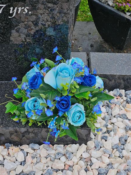 Enhance the resting place of your loved one with our unique artificial grave flower arrangement, featuring unusual shades of blue. Meticulously crafted by our professionally trained florist at flowersbydebshop, this one-of-a-kind piece comes anchored in a weighted gravepot for added stability.