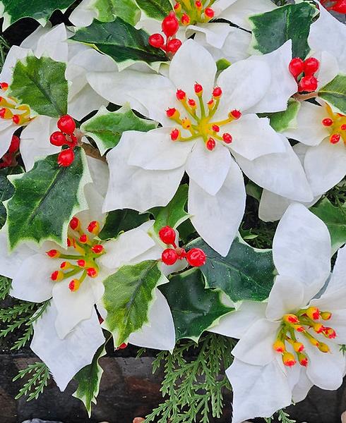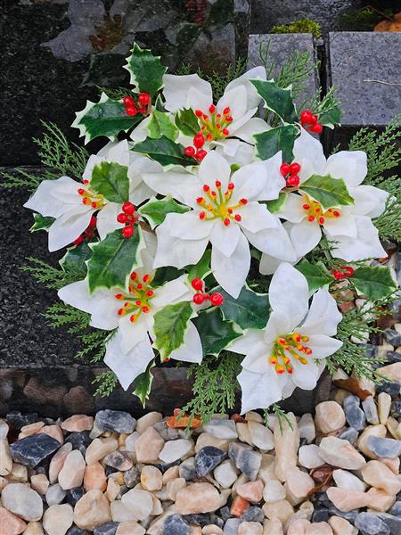 Featuring realistic ivory poinsettias, berried ivy, and festive foliage, this arrangement brings a serene beauty to any memorial. It comes in a weighted standard fit grave pot, ensuring stability and longevity.