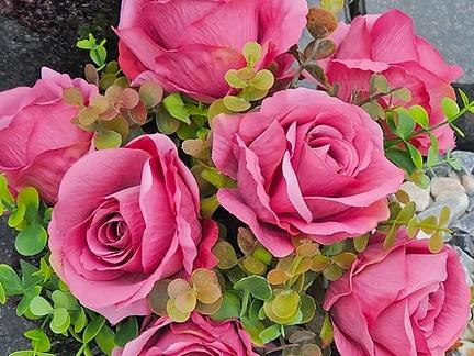 Our Realistic Artificial Pink Rose & Eucalyptus Grave Flower Arrangement at flowersbydebshop is thoughtfully designed to honour your loved ones with elegance and grace. Featuring lifelike large-headed pink roses and lush eucalyptus foliage, this arrangement comes in a weighted grave pot to ensure stability.
