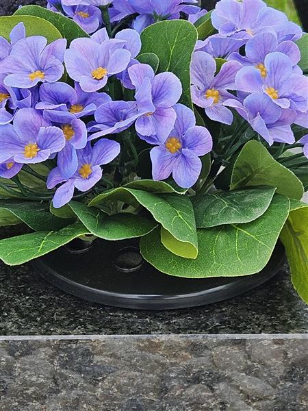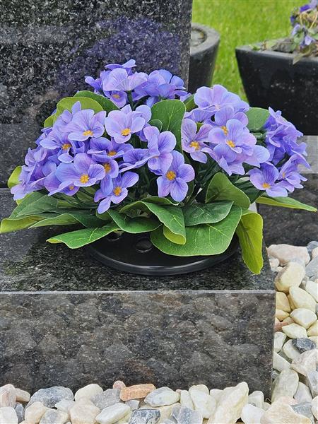 Cute realistic artificial lilac primulas set in weighted grave pot