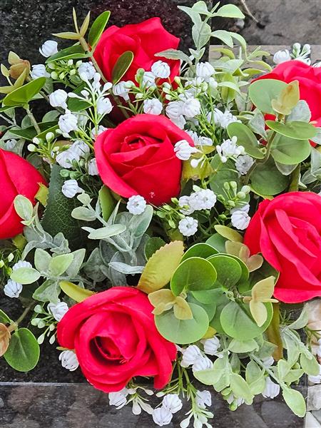 Add a touch of perpetual beauty to a loved one's resting place with our meticulously crafted Red Rosebud & Gypsophilia Grave flower arrangement. Featuring realistic artificial red rosebuds, white gypsophilia, and lush eucalyptus foliage, each piece is individually hand arranged and secured into a weighted grave pot to ensure stability.