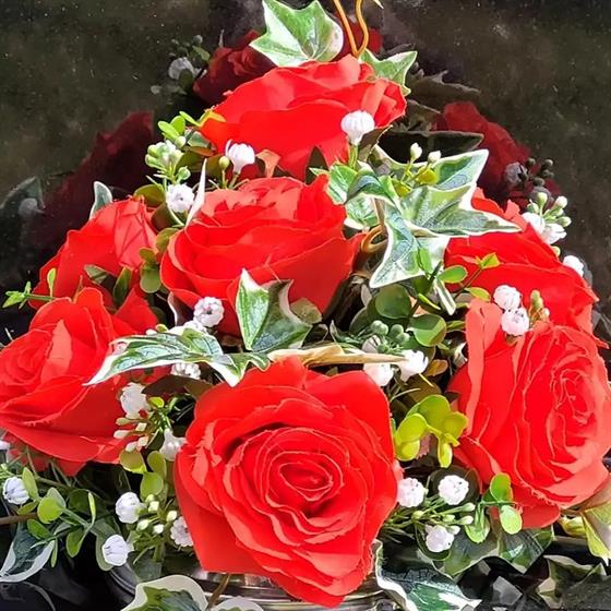 Featuring highly realistic large headed open red roses, white gypsophilia and ivy foliage. All flowers and foliage have been hand arranged and set in your choice of pot (please speak to Chris @ Manor Memorials regarding pot choice).