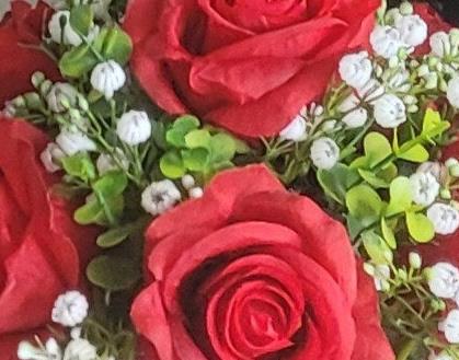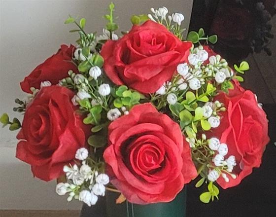 Featuring highly realistic large headed red roses, white gypsohilia & eucalyptus foliage.
