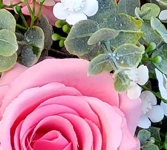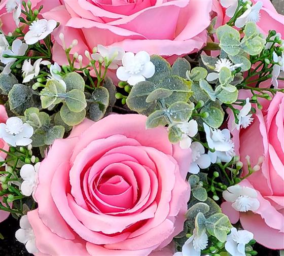 Unique to flowersbydeb this gorgeous graveflower arrangement features highly realistic large pink open headed roses, white gypsophilia (gypsy grass/baby's breath) & eucalyptus foliage - individually hand arranged