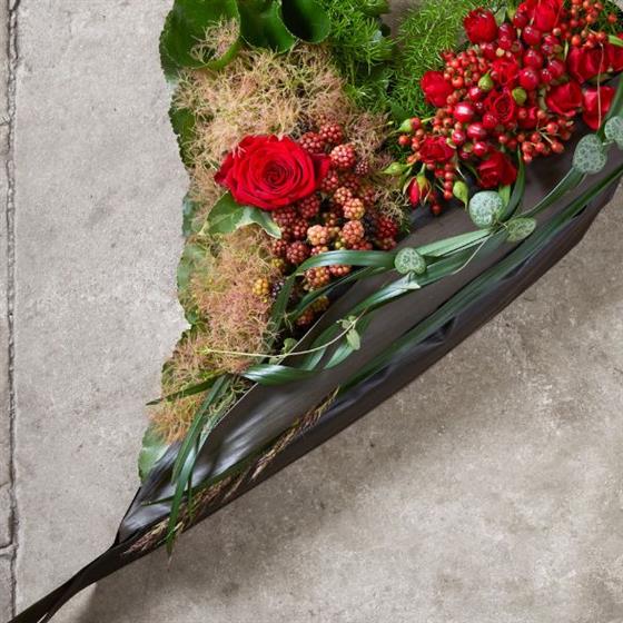 This contemporary heart-shaped tribute features patterns of textural foliage, giving it a modern appearance. Berries and red roses take centre stage, and its cutting-edge design is a stylish and unforgettable expression of love.