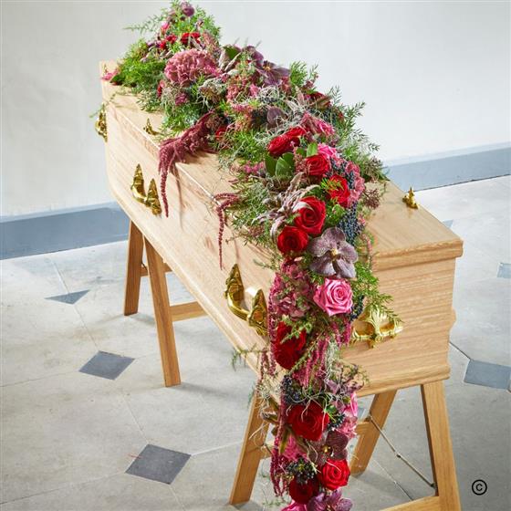 For the love of your life, a lavish garland of romantic crimson and pink roses is set against a backdrop of burgundy tones and enhanced with exotic orchids. This dreamy garland meanders across the coffin before cascading.