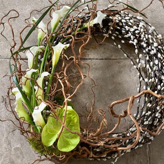 Portray the essence of springtime with a pussy willow wreath topped with an elegant calla lily spray. An ecofriendly wreath that is enhanced with curvy twigs to create an ode to spring for a nature enthusiast.