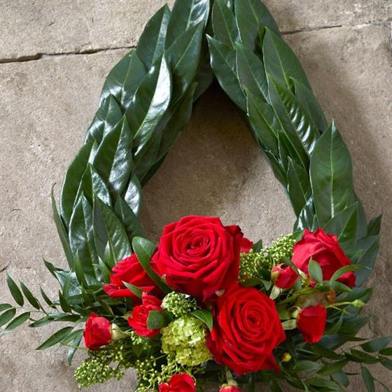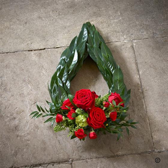 Teardrop chaplet design created in glossy foliage with a luxurious red rose spray. Suitable as a floral tribute for the coffin or graveside.