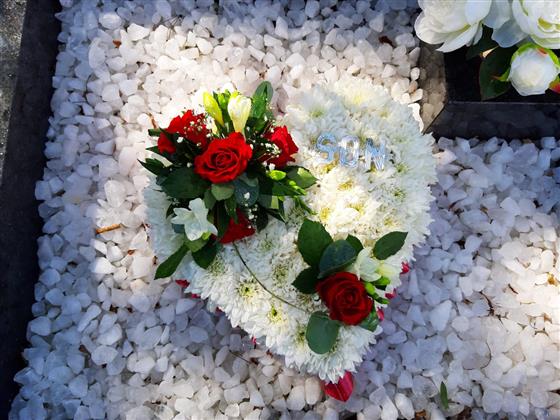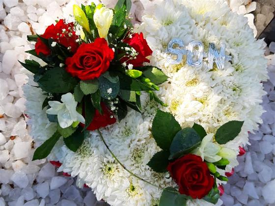 Medium size massed heart edged with coloured ribbon and finished with a main spray and a smaller spray (to represent the family and the link to the dearly departed)