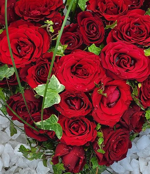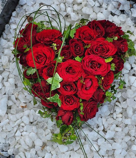 Fabulous and decadent, mixed fresh red velvet red roses, arranged with ivy to form a compact heart shape finished with an ivy outer edging and tail