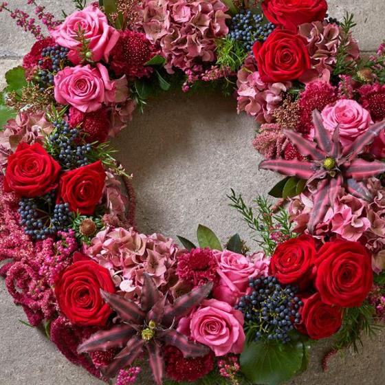 The symbolic circular wreath features vibrant groups of shocking pink and red roses, creating a youthful appeal. It is a statement tribute that celebrates a vivacious life and offers heartfelt condolences of love.