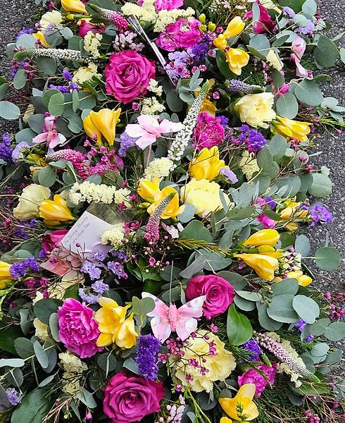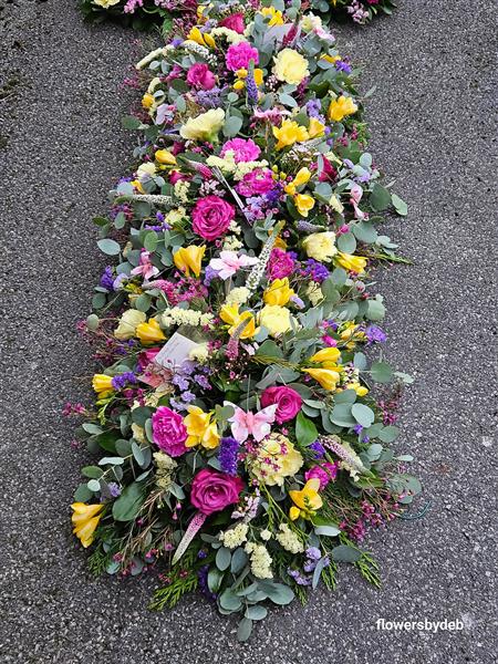 Elevate your tribute with our versatile Multi Purpose Coffin Spray from flowersbydebshop. This stunning pastel coffin spray, featuring fragrant freesia, measures approximately 4ft in length and seamlessly converts to 3 elegant table centre arrangements, thanks to the included stabiliser board. Adorned with delicate butterflies and available in a range of colours (pastel shown in photographs)