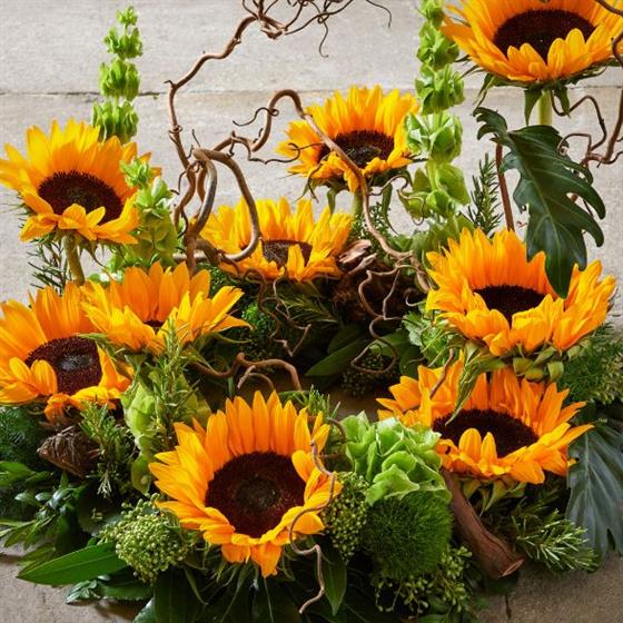 Popular sunflower's bold, sunny faces give this contemporary wreath a cheery reminder of happier days. With its natural charm and reminiscences of brighter days, it is an ideal tribute for young people.