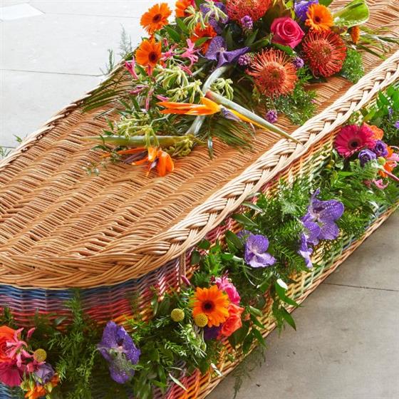 Tropical style coffin spray for the top of the coffin, with coordinating foliage and flowers placed around the sides.